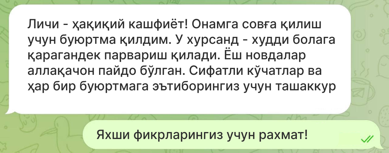 Бизнинг Личиларимиз барча ҳудудларда муваффақиятли жойлашиб, мева бермоқда.