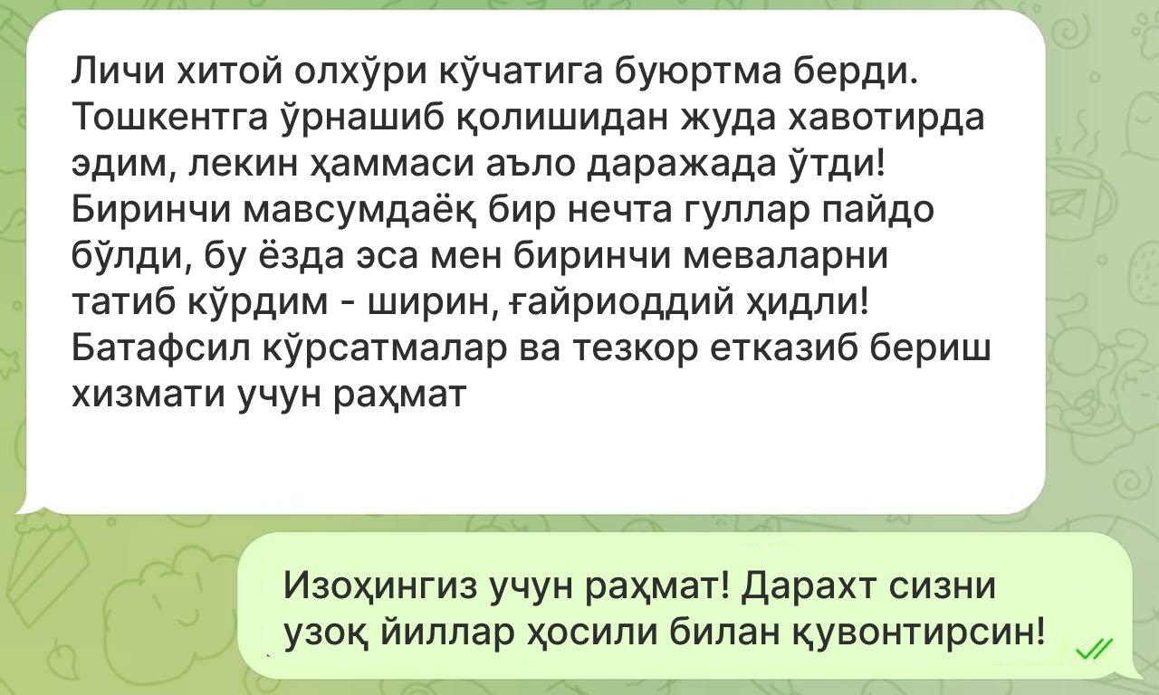 Анкетани тўлдиринг ва мутахассисимиз сиз билан боғланиб, энг мос Личи кўчатини танлайди ва етказиб бериш ҳақида маълумот беради.