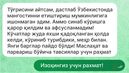 Ҳозироқ эксклюзив мангостин кўчатларини харид қилинг ва уйингизда тропик жаннатни яратинг!