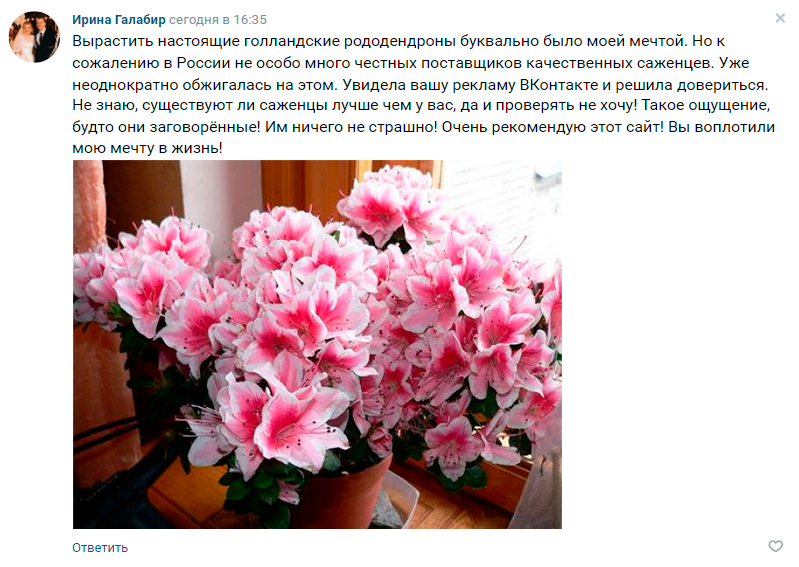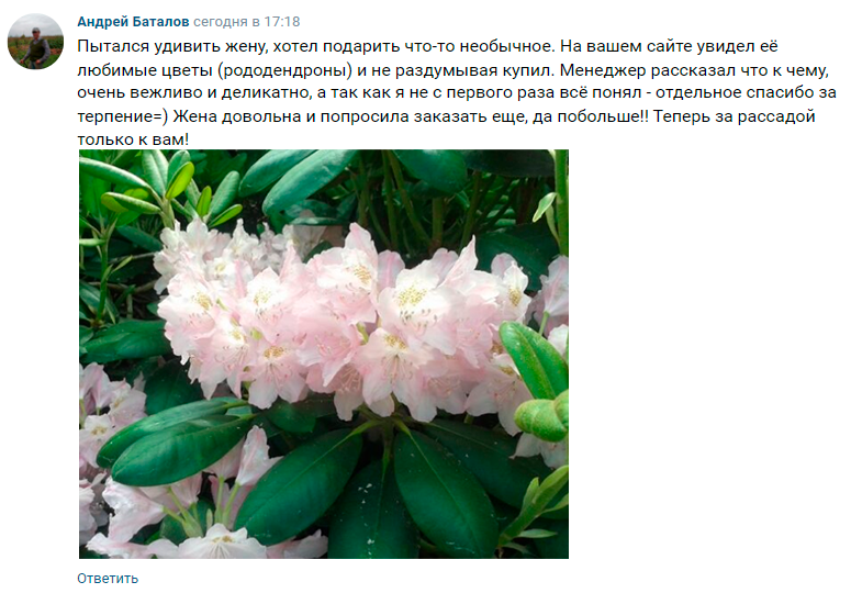 Bizning rododendronlarimiz sovuqqa chidamli, qishda ham gullaydi va alohida g'amxo'rlikka muhtoj emas.
